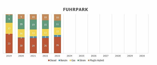 Die Grafik zeigt die aktuelle Zusammensetzung unseres Fuhrparks, aufgeteilt nach Antriebsarten Diesel/Benzin/Gas/Strom und PlugIn-Hybrid. Einen besonders hohen Anteil an konventionellen Verbrennungsmotoren weist der Nutzfahrzeugbereich auf.